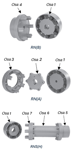 RN(A) tüüpi siduri puhul on osa 1 ühendatud osadega 2 ja 3. Osad 2 ja 3 tarnitakse ühe osana ning neid saab eraldada mõne kruvi lahti keeramise teel. See võimaldab ühe osa liigutamist ja kummist elemendi välja vahetada ilma mootorit või reduktorit liigutamata.